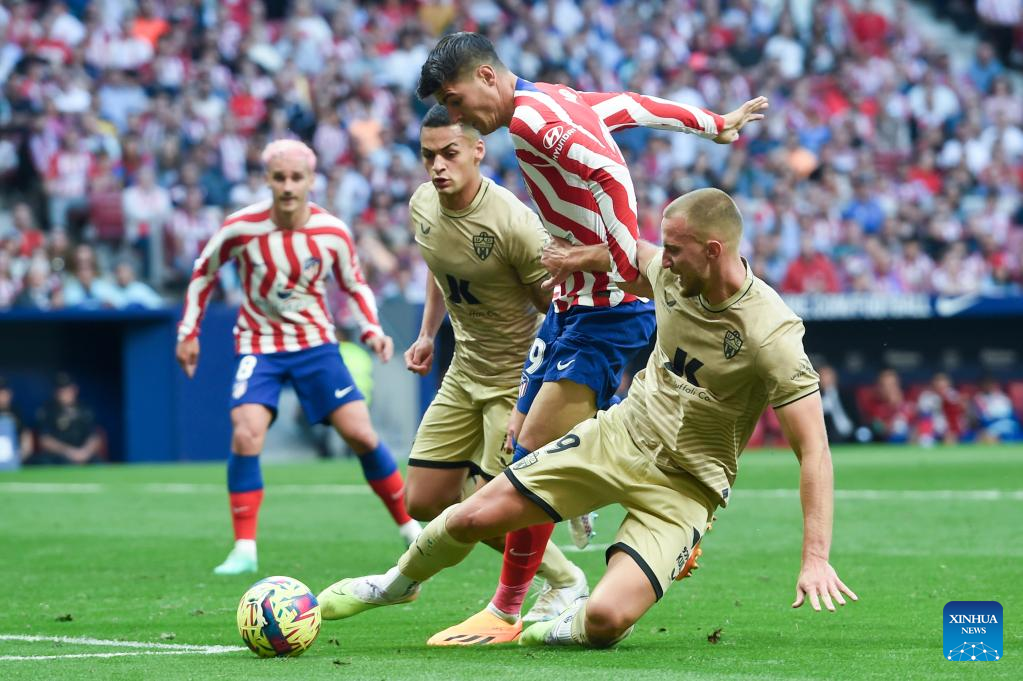 Almeria's Rodrigo Ely (1st R) vies with Atletico de Madrid's Alvaro Morata (2nd R) during a Spanish La Liga football match between Atletico de Madrid and UD Almeria in Madrid, Spain, on April 16, 2023. (Photo by Gustavo Valiente/Xinhua)