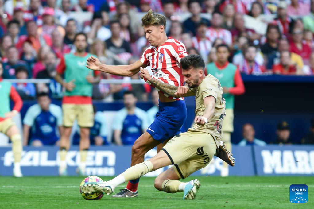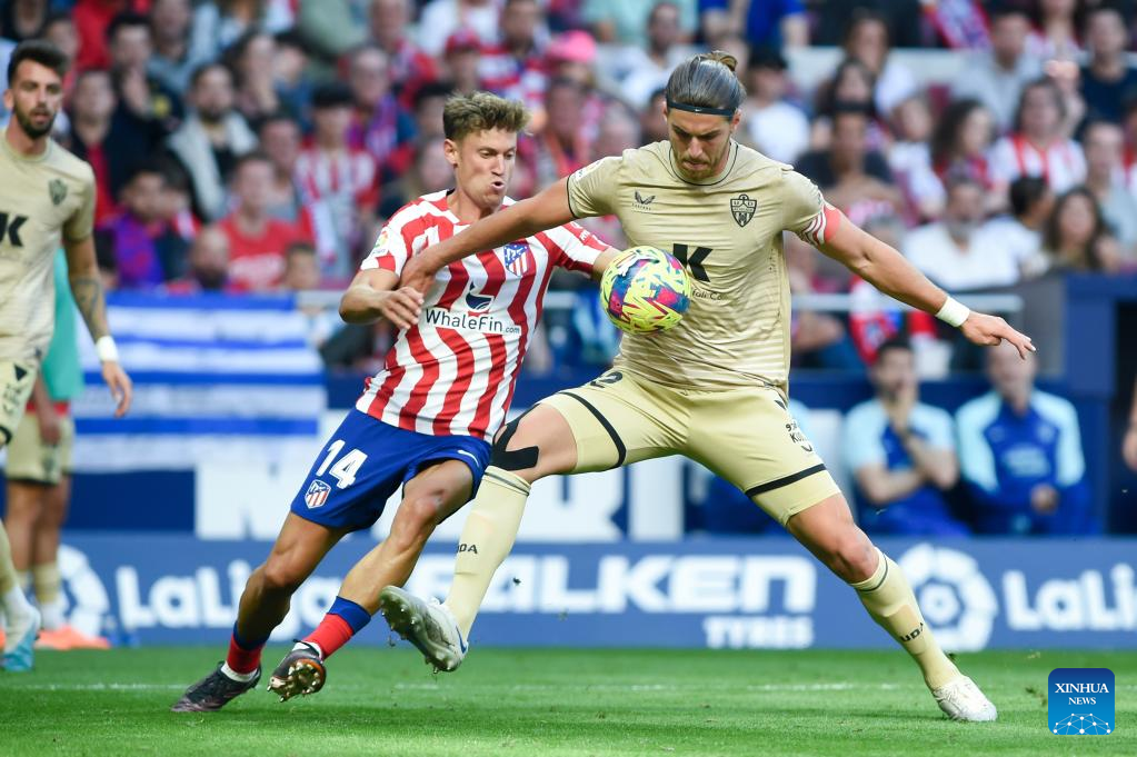 Almeria's Srdjan Babic (R) vies with Atletico de Madrid's Marcos Llorente during a Spanish La Liga football match between Atletico de Madrid and UD Almeria in Madrid, Spain, on April 16, 2023. (Photo by Gustavo Valiente/Xinhua)