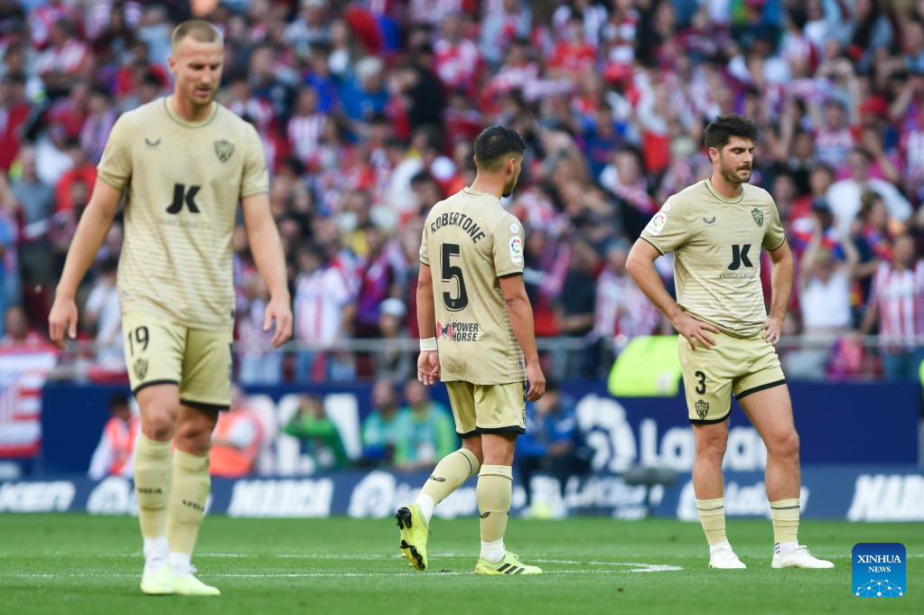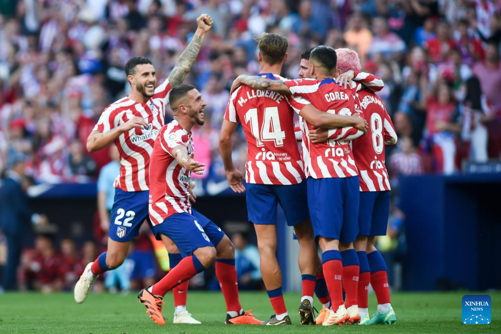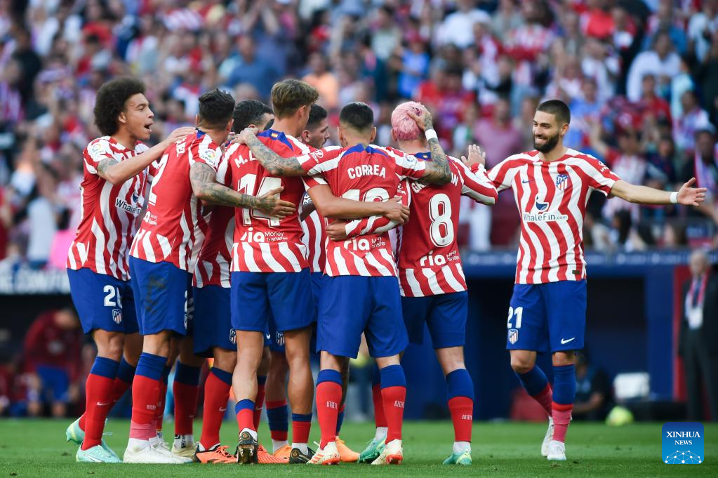 Atletico de Madrid's players celebrate during a Spanish La Liga football match between Atletico de Madrid and UD Almeria in Madrid, Spain, on April 16, 2023. (Photo by Gustavo Valiente/Xinhua)