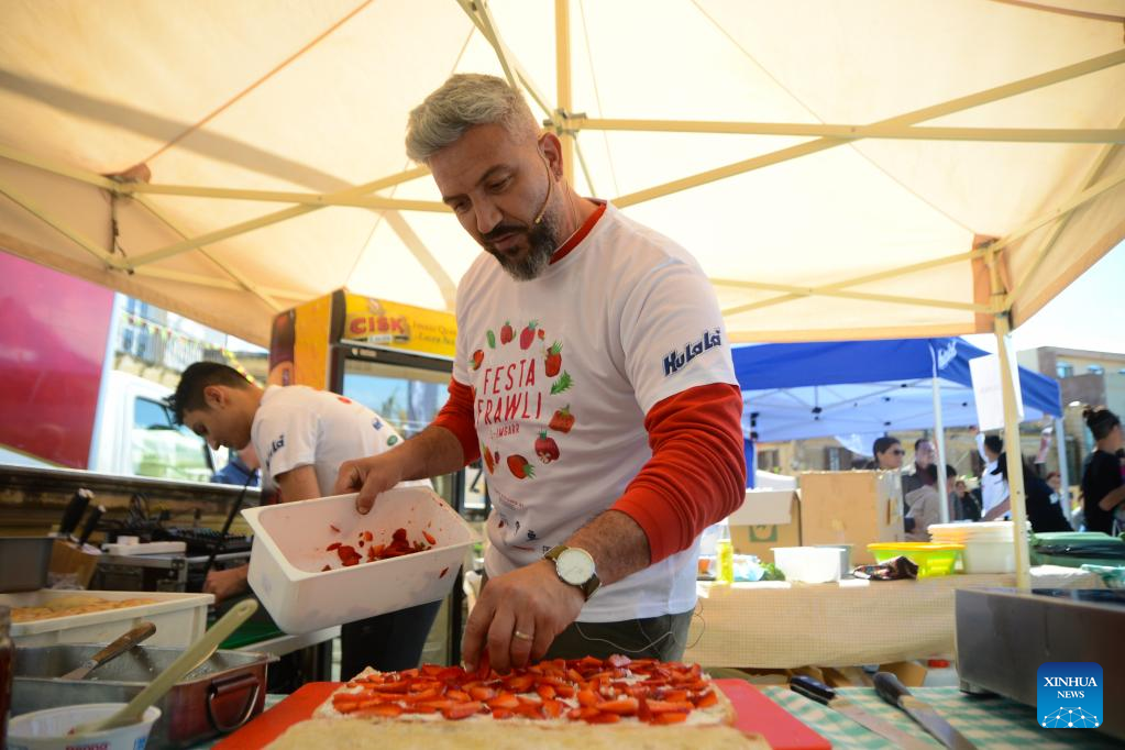 A man makes food with fresh strawberries in Mgarr, Malta, on April 16, 2023. Malta on Sunday held its annual strawberry festival in Mgarr, a picturesque agricultural village in north Malta. (Photo by Jonathan Borg/Xinhua)