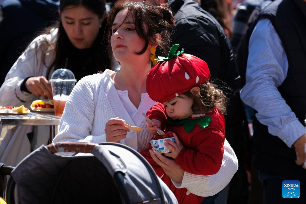 A little girl eats food made with strawberries in Mgarr, Malta, on April 16, 2023. Malta on Sunday held its annual strawberry festival in Mgarr, a picturesque agricultural village in north Malta. (Photo by Jonathan Borg/Xinhua)