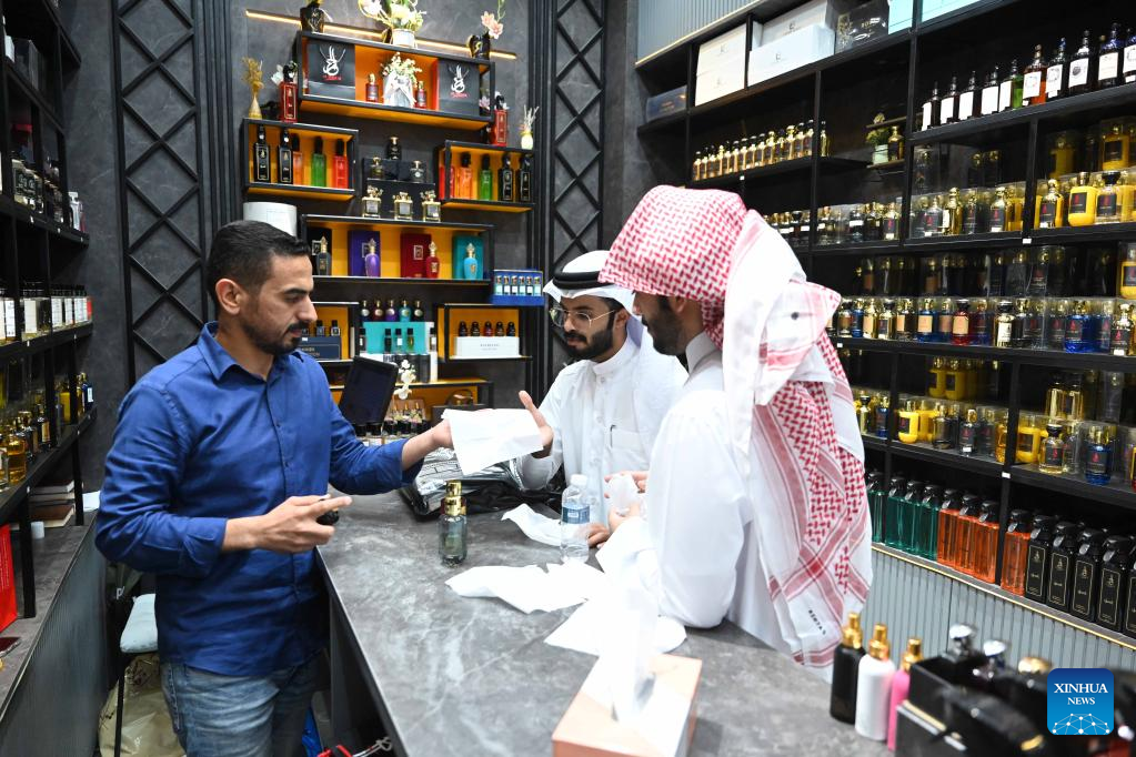 A man visits a perfume shop in Capital Governorate, Kuwait, April 16, 2023. People in Kuwait go shopping in preparation of the upcoming Eid al-Fitr, which marks the end of the Islamic holy month of Ramadan. (Photo by Asad/Xinhua)