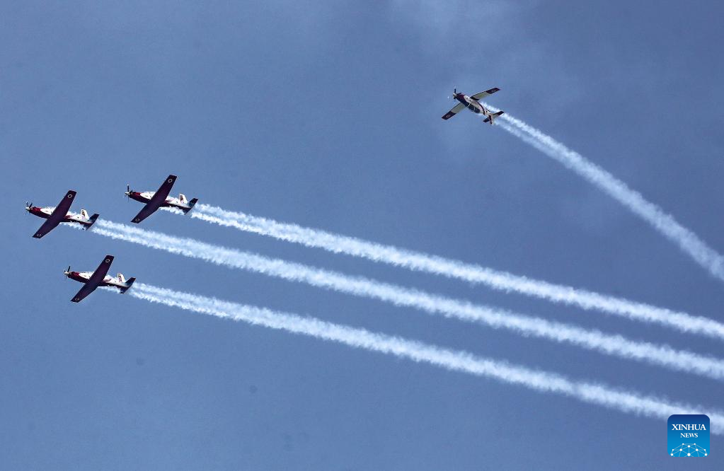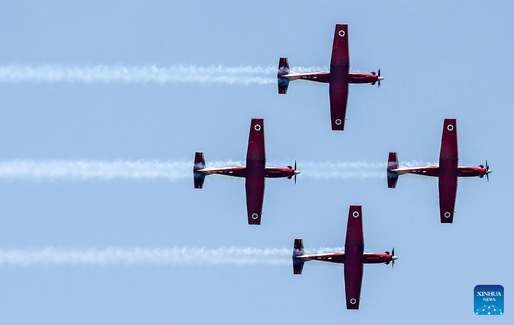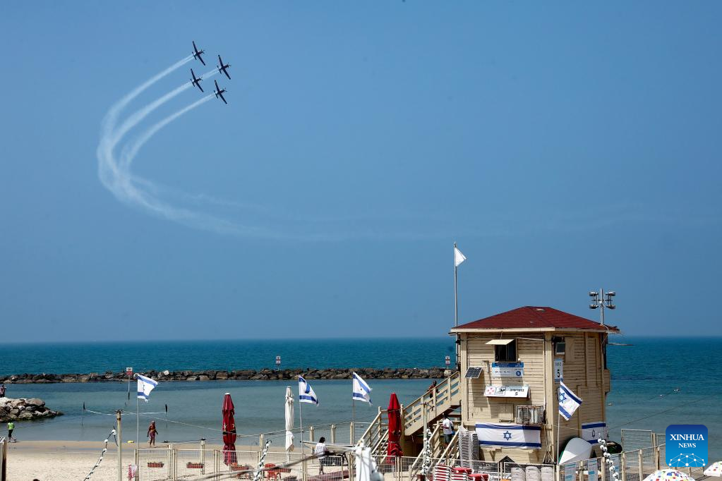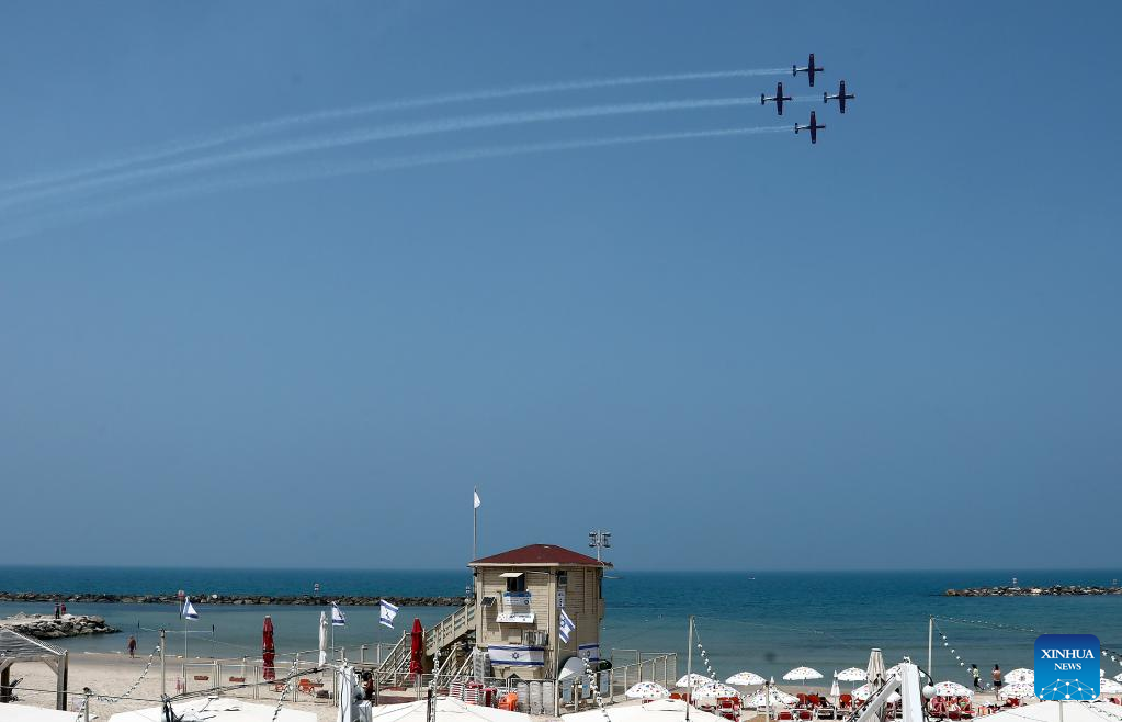 Aircraft of the Israeli Air Force Aerobatic Team fly during a training for the upcoming Israel's Independence Day in Tel Aviv, Israel, on April 17, 2023. (Gideon Markowicz/JINI via Xinhua)