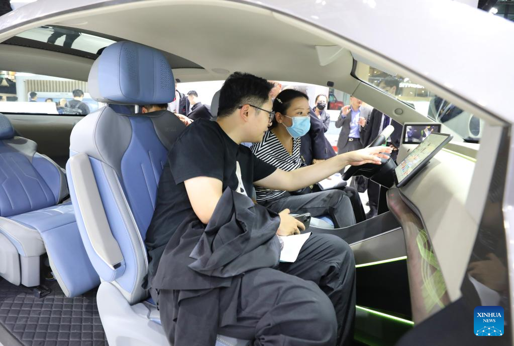 Visitors try a HarmonyOS-based on-board intelligent computer terminal at the Huawei booth at the 20th Shanghai International Automobile Industry Exhibition in east China's Shanghai, April 18, 2023.