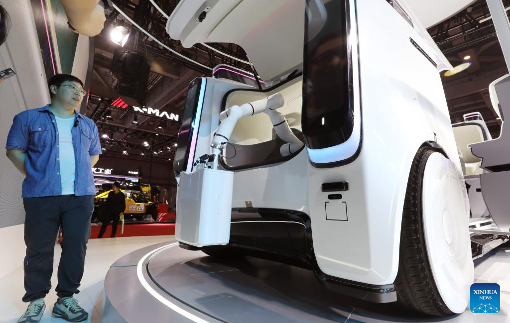 A visitor looks at an autonomous vehicle of DiDi at the 20th Shanghai International Automobile Industry Exhibition in east China's Shanghai, April 18, 2023.