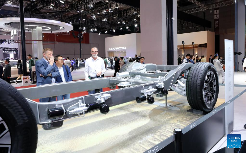 An intelligent hydraulic body control system by Chinese carmaker BYD is displayed at the 20th Shanghai International Automobile Industry Exhibition in east China's Shanghai, April 19, 2023.