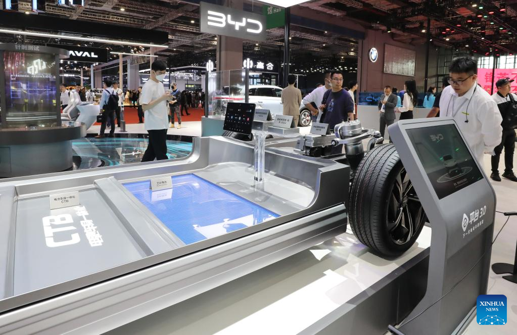 The CTB battery body integration technology of Chinese carmaker BYD is displayed at the 20th Shanghai International Automobile Industry Exhibition in east China's Shanghai, April 19, 2023.