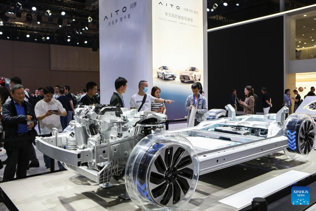 An intelligent extended driving range 4MATIC platform of Aito M5 is displayed at the 20th Shanghai International Automobile Industry Exhibition in east China's Shanghai, April 18, 2023.