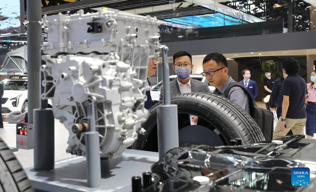 Visitors discuss while examining an NEV platform of Cadillac at the 20th Shanghai International Automobile Industry Exhibition in east China's Shanghai, April 18, 2023.