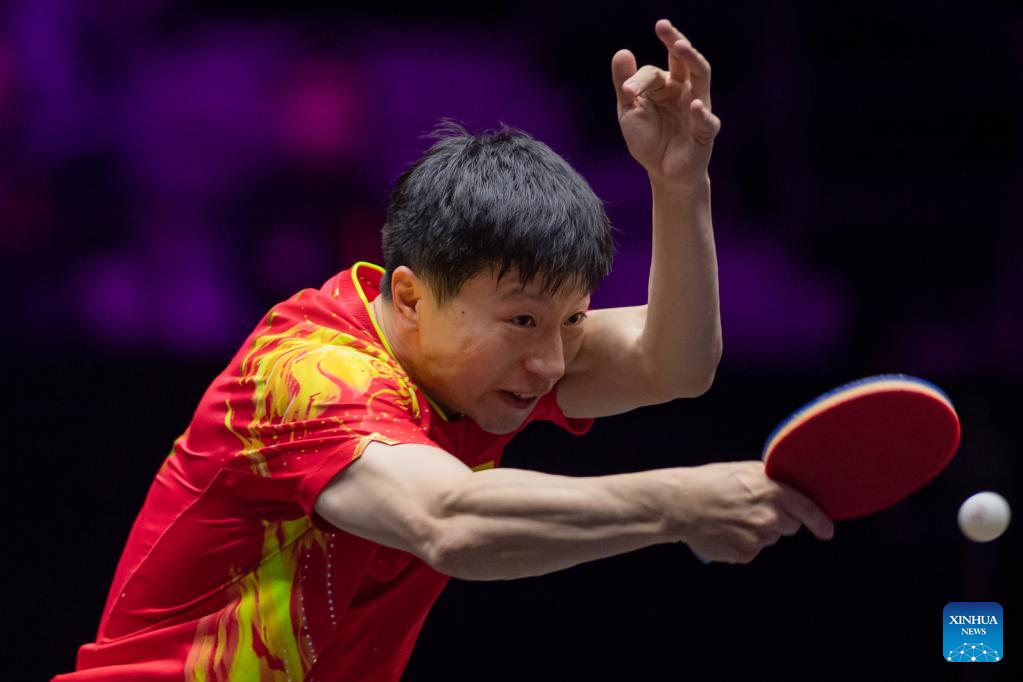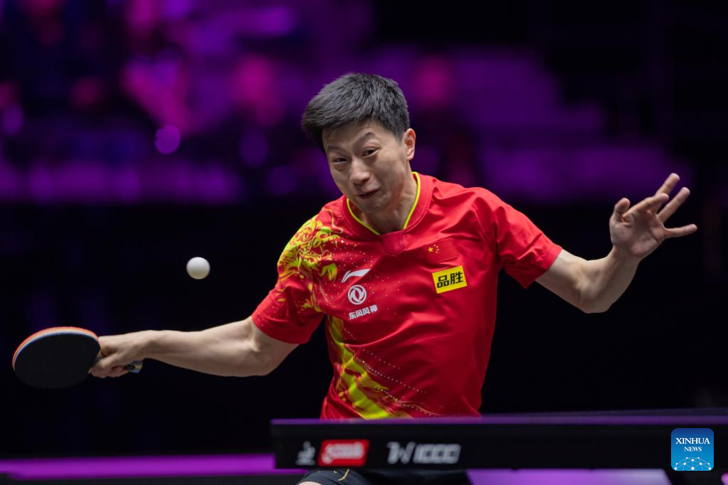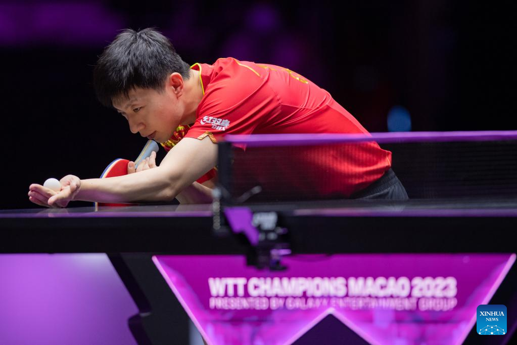 Ma Long of China hits a return during the men's singles round of 16 match against Liam Pitchford of England at the WTT Champions Macao 2023 in Macao, south China, April 19, 2023. (Xinhua/Cheong Kam Ka)