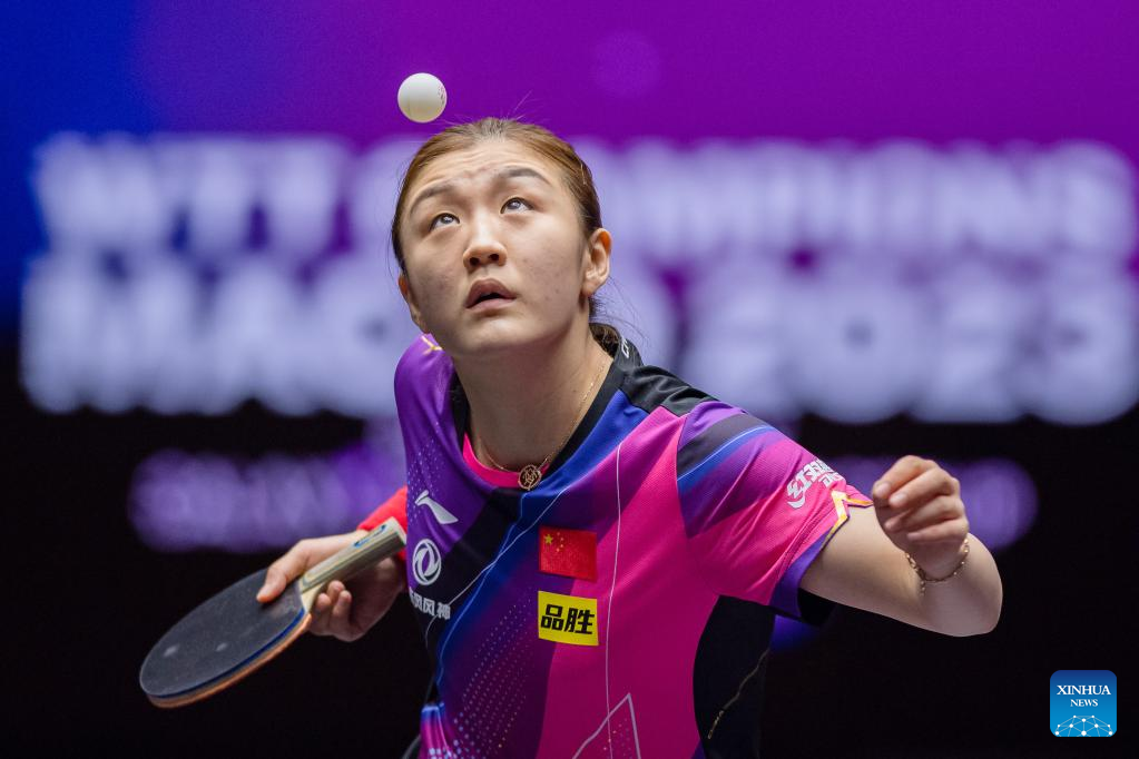 Chen Meng of China hits a return during the women's singles round of 16 match against Ishikawa Kasumi of Japan at the WTT Champions Macao 2023 in Macao, south China, April 19, 2023. (Xinhua/Cheong Kam Ka)