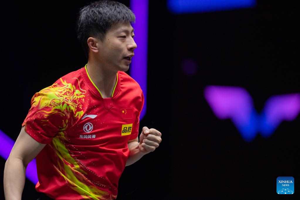 Ma Long of China celebrates scoring during the men's singles round of 16 match against Liam Pitchford of England at the WTT Champions Macao 2023 in Macao, south China, April 19, 2023. (Xinhua/Cheong Kam Ka)