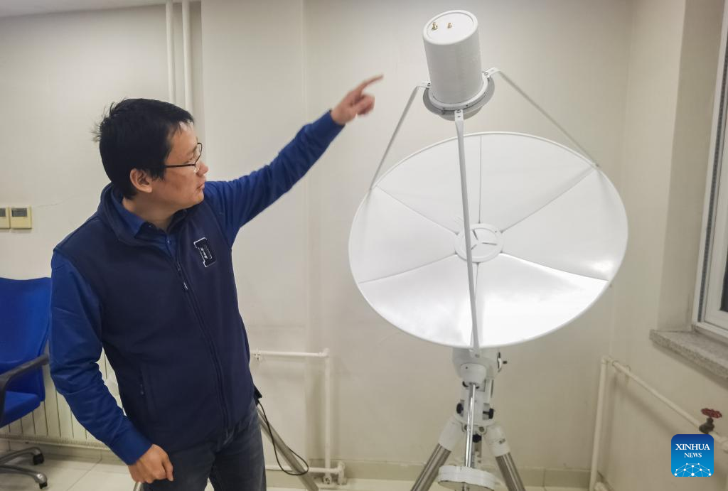 Shao Lijing, researcher from the Kavli Institute for Astronomy and Astrophysics at Peking University, demonstrates how a radio telescope works at Peking University in Beijing, capital of China, on Nov. 1, 2022. (Xinhua/Yu Fei)