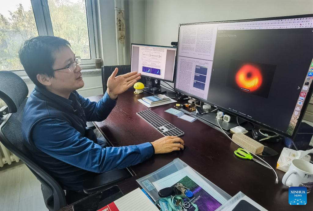 Shao Lijing, researcher from the Kavli Institute for Astronomy and Astrophysics at Peking University, introduces an image of a black hole at Peking University in Beijing, capital of China, on Nov. 1, 2022. (Xinhua/Yu Fei)