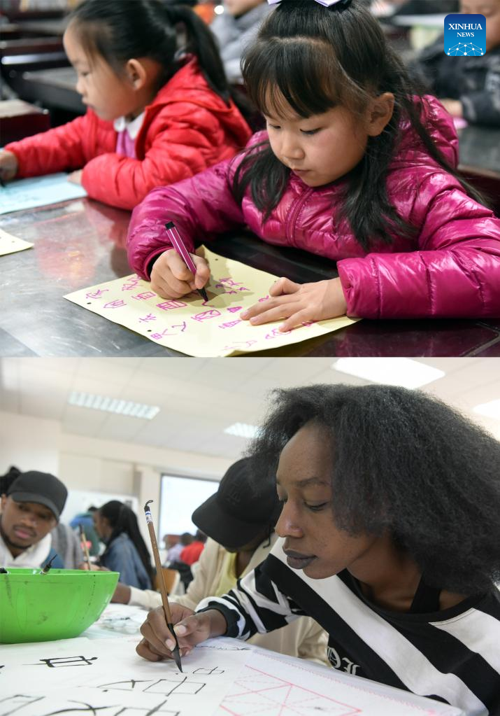 This combo photo shows children experiencing oracle bone script writing at the National Museum of Chinese Writing in Anyang, central China's Henan Province, Nov. 25, 2017 (upper, photo taken by Li Jianan), and Kenyan students writing Chinese calligraphy during an event celebrating the UN Chinese Language Day at the Confucius Institute at the University of Nairobi, in Nairobi, Kenya, April 18, 2023 (lower, photo taken by Han Xu). The UN Chinese Language Day is observed on April 20 every year since 2010, celebrating the language's contribution to the world while encouraging more people to learn it. (Xinhua)