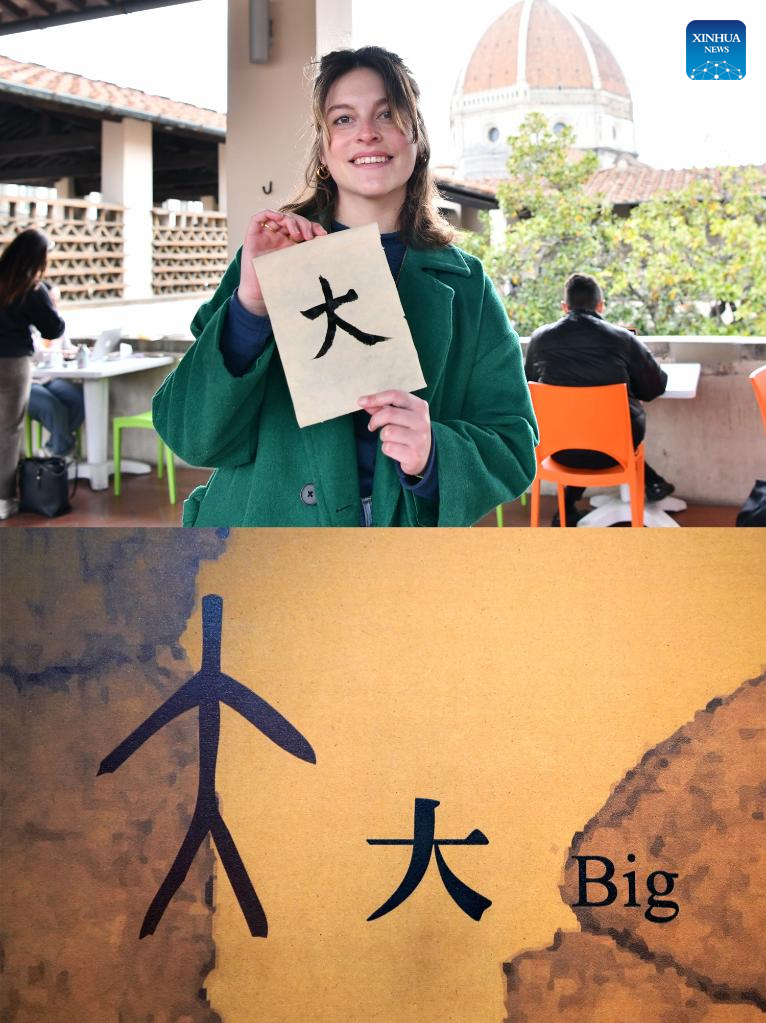 This combo photo shows Chinese culture enthusiast Anna demonstrating the Chinese character "Da", meaning "big", at an activity held by the Confucius Institute at the University of Florence in Florence, Italy, April 13, 2023, (upper, photo taken by Jin Mamengni), and the oracle bone script character "Da" (L), meaning "big", pictured at the National Museum of Chinese Writing in Anyang, central China's Henan Province on April 19, 2023 (lower, photo taken by Li An). The UN Chinese Language Day is observed on April 20 every year since 2010, celebrating the language's contribution to the world while encouraging more people to learn it. (Xinhua)