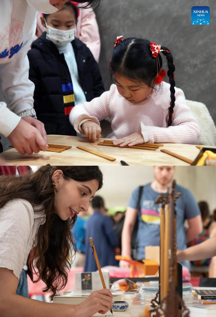 This combo photo shows children experiencing bamboo slips for writing at the National Museum of Chinese Writing in Anyang, central China's Henan Province, Feb. 4, 2023 (upper, photo taken by Lan Hongguang), and a visitor experiencing Chinese calligraphy during an event celebrating the UN Chinese Language Day in Rio de Janeiro, Brazil, on April 19, 2023 (lower, photo taken by Wang Tiancong). The UN Chinese Language Day is observed on April 20 every year since 2010, celebrating the language's contribution to the world while encouraging more people to learn it. (Xinhua)