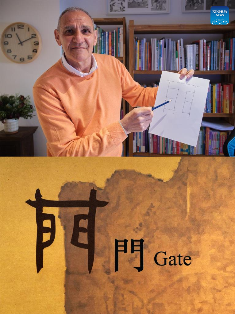 This combo photo shows Alfonso Fraile, an ex-football player from Spain, demonstrating an oracle bone script character "Men", meaning "gate", in Madrid, Spain, April 17, 2023 (upper, photo taken by Meng Dingbo), and the oracle bone script character "Men" (L), meaning "gate", pictured at the National Museum of Chinese Writing in Anyang, central China's Henan Province on April 19, 2023 (lower, photo taken by Li An). The UN Chinese Language Day is observed on April 20 every year since 2010, celebrating the language's contribution to the world while encouraging more people to learn it. (Xinhua)