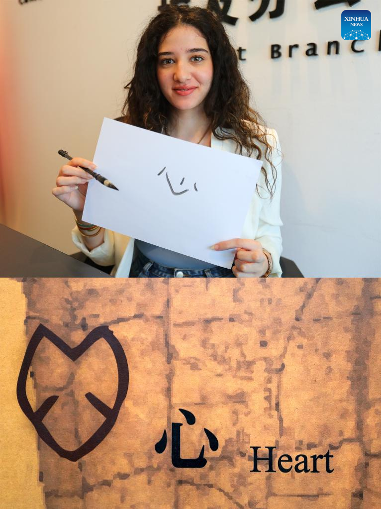 This combo photo shows Asmaa Mostafa Ibrahim, a Chinese culture enthusiast from Egypt, demonstrating the Chinese character "Xin", meaning "heart", written with a brush in Cairo, Egypt, April 13, 2023 (upper, photo taken by Sui Xiankai), and the oracle bone script character "Xin" (L), meaning "heart", pictured at the National Museum of Chinese Writing in Anyang, central China's Henan Province on April 19, 2023 (lower, photo taken by Li An). The UN Chinese Language Day is observed on April 20 every year since 2010, celebrating the language's contribution to the world while encouraging more people to learn it. (Xinhua)