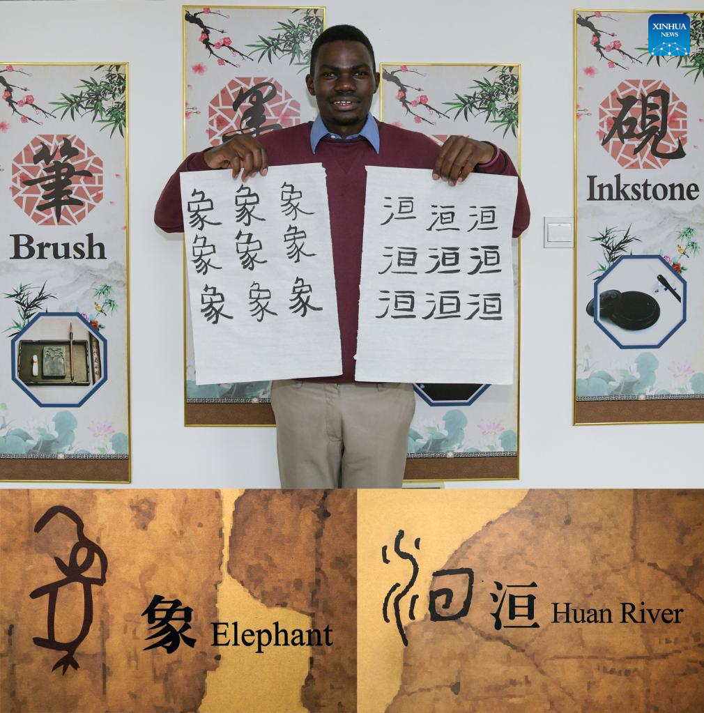 This combo photo shows Agwata Amos Michira, a Chinese culture enthusiast from Kenya, showing the Chinese character "Xiang", (L) meaning "elephant", and the character "Huan", meaning "Huan River", at the Confucius Institute at the University of Nairobi in Nairobi, Kenya, April 17, 2023 (upper, photo taken by Han Xu), and the oracle bone script characters "Xiang" (L), meaning "elephant", and "Huan", meaning "Huan River", pictured at the National Museum of Chinese Writing in Anyang, central China's Henan Province on April 19, 2023 (lower, photo taken by Li An). The UN Chinese Language Day is observed on April 20 every year since 2010, celebrating the language's contribution to the world while encouraging more people to learn it. (Xinhua)