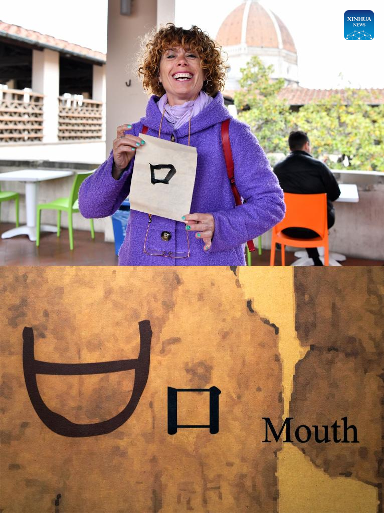 This combo photo shows a Chinese culture enthusiast demonstrating the Chinese character "Kou", meaning "mouth", at an activity held by the Confucius Institute at the University of Florence in Florence, Italy, April 13, 2023, (upper, photo taken by Jin Mamengni), and the oracle bone script character "Kou" (L), meaning "mouth", pictured at the National Museum of Chinese Writing in Anyang, central China's Henan Province on April 19, 2023 (lower, photo taken by Li An). The UN Chinese Language Day is observed on April 20 every year since 2010, celebrating the language's contribution to the world while encouraging more people to learn it. (Xinhua)
