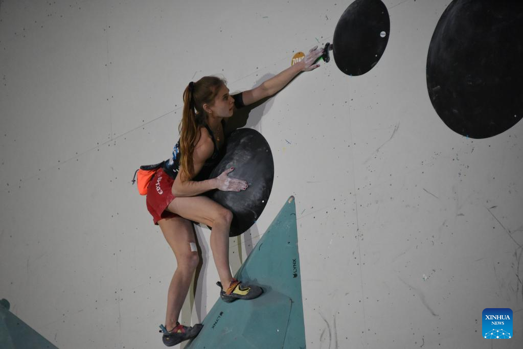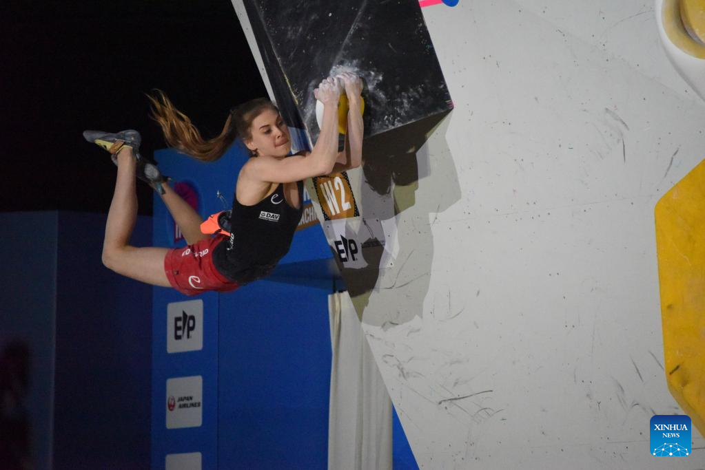 Hannah Meul of Germany competes during the women's boulder final of IFSC Climbing World Cup 2023 in Hachioji, Japan on April 22, 2023. (Xinhua/Yue Chenxing)