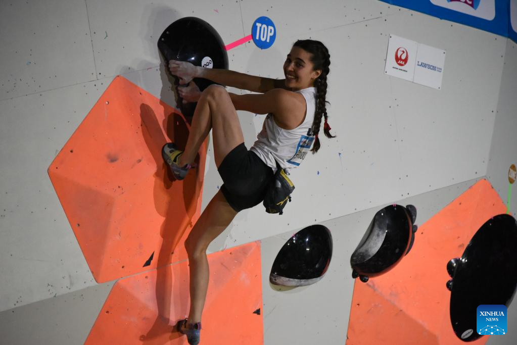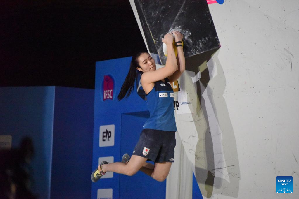 Matsufuji Anon of Japan competes during the women's boulder final of IFSC Climbing World Cup 2023 in Hachioji, Japan on April 22, 2023. (Xinhua/Yue Chenxing)