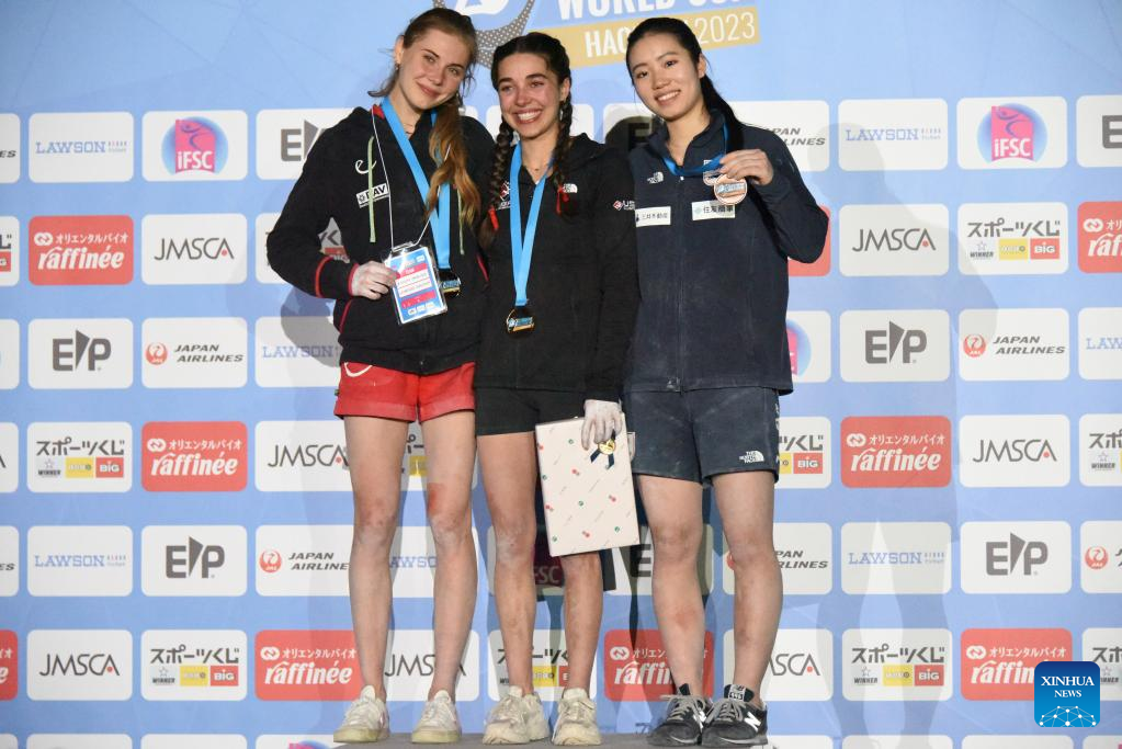 Second-placed Hannah Meul of Germany, first-placed Brooke Raboutou of the United States and third-placed Matsufuji Anon of Japan pose on the podium of the women's boulder final of IFSC Climbing World Cup 2023 in Hachioji, Japan on April 22, 2023. (Xinhua/Yue Chenxing)