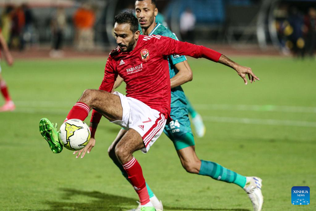 Kahraba (front) of Al Ahly competes during a Confederation of African Football (CAF) Champions League quarterfinal match between Al Ahly and Raja Casablanca in Cairo, Egypt on April 22, 2023. (Xinhua/Ahmed Gomaa)
