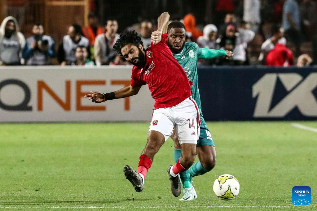 Amr El Soleya (L) of Al Ahly competes with Walid Sabbar of Raja Casablanca during a Confederation of African Football (CAF) Champions League quarterfinal match between Al Ahly and Raja Casablanca in Cairo, Egypt on April 22, 2023. (Xinhua/Ahmed Gomaa)