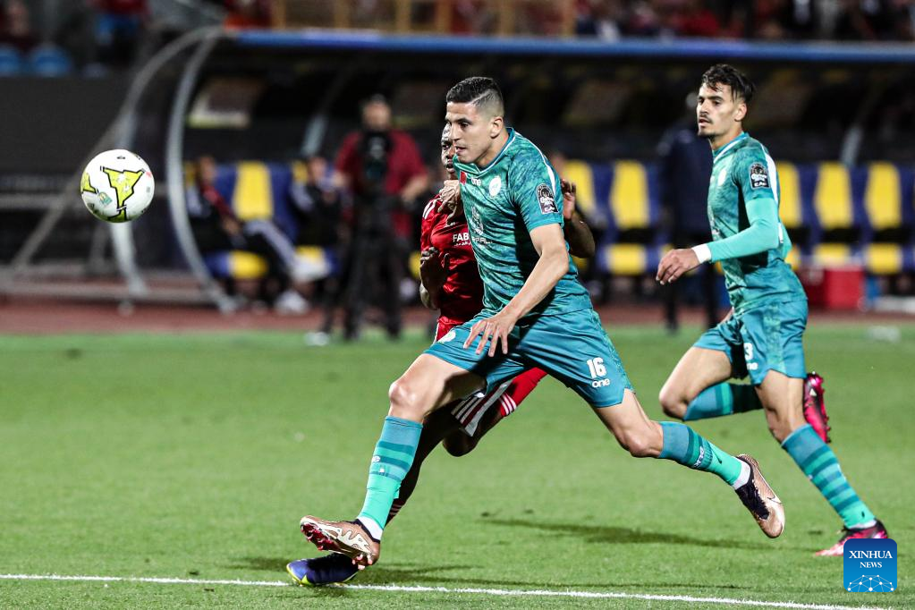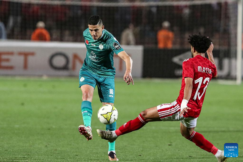 Mohamed Nahiri (front) of Raja Casablanca competes during a Confederation of African Football (CAF) Champions League quarterfinal match between Al Ahly and Raja Casablanca in Cairo, Egypt on April 22, 2023. (Xinhua/Ahmed Gomaa)