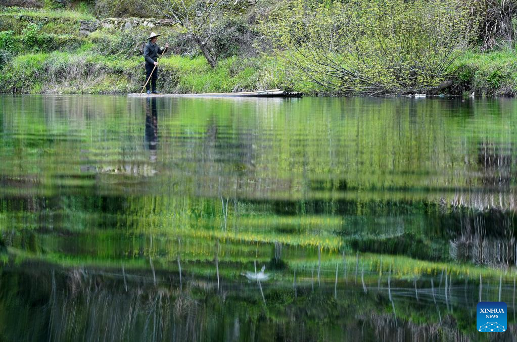 Ma Qinghai, a villager of Shangtan Village, rows a bamboo raft in Ziyang Town of Wuyuan County, east China's Jiangxi Province, March 30, 2023. Wuyuan County, one of the six counties of ancient Huizhou, covers an area of nearly 3,000 square kilometers. Waterways in Wuyuan are narrow and densely interconnected. Locals often row bamboo rafts on the river. Rowing bamboo rafts is the unique exercise for villagers here, Ma said.
