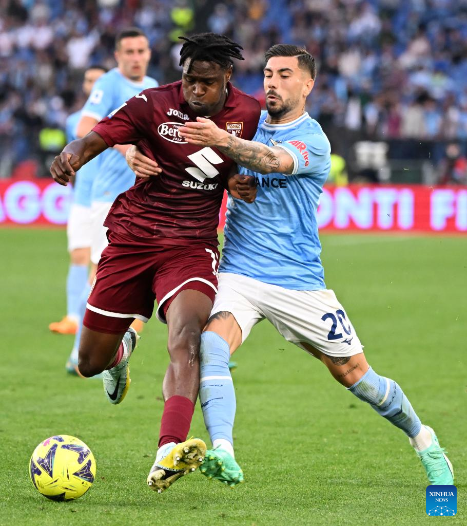 Lazio's Nicolo Casale (R) vies with Torino's Yann Karamoh during a Serie A football match between Lazio and Torino in Rome, Italy, April 22, 2023. (Photo by Augusto Casasoli/Xinhua)