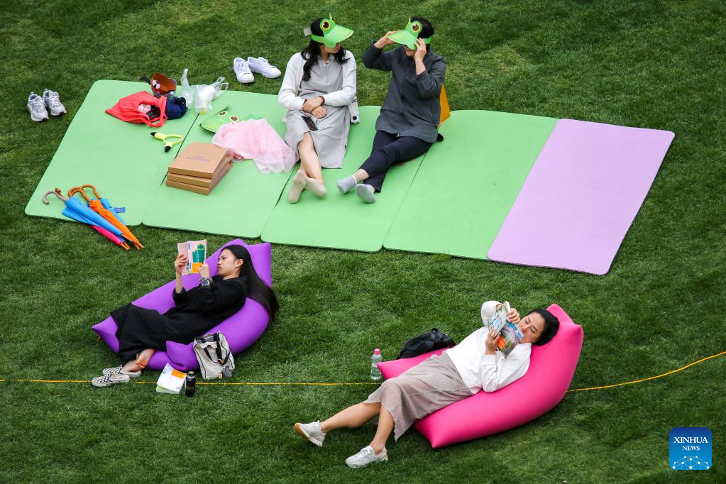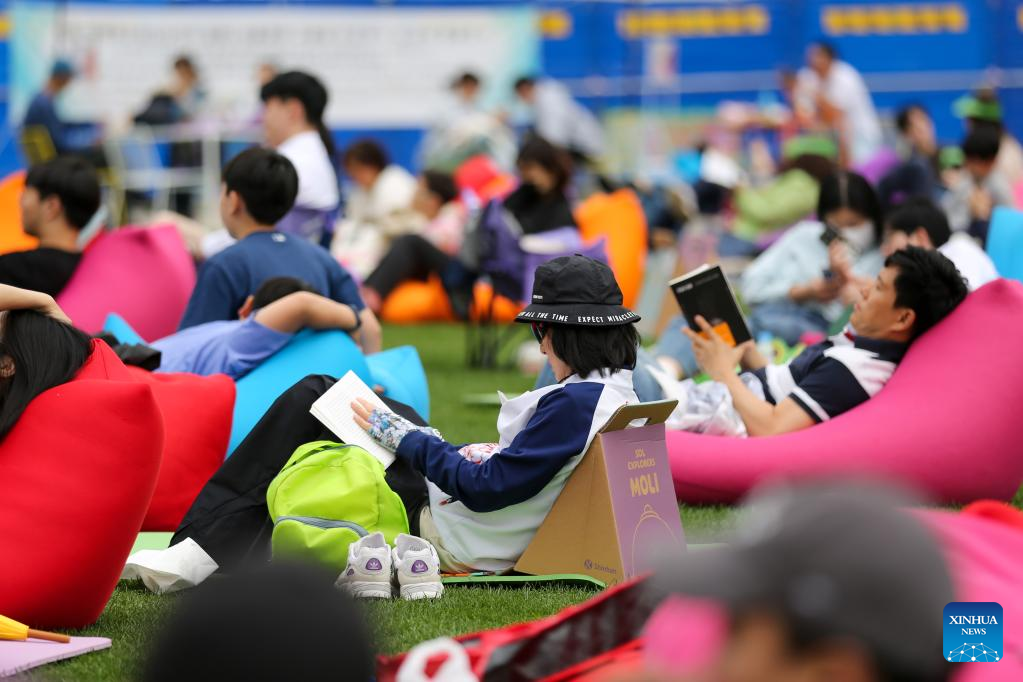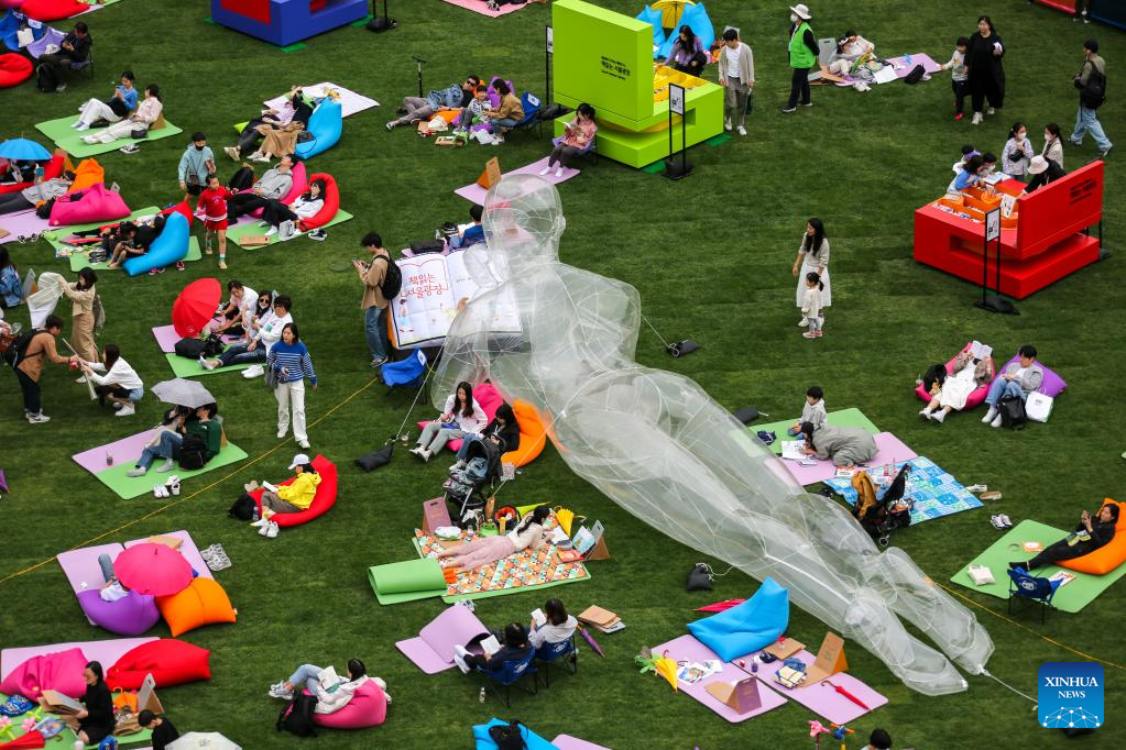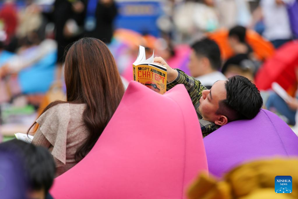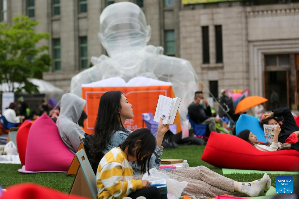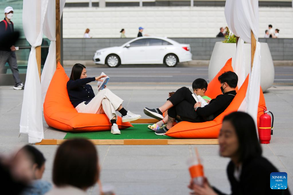 People read books at Seoul Plaza in Seoul, South Korea, April 23, 2023. Reading activities were held at Seoul Plaza and Gwanghwamun Square in downtown Seoul on the occasion of World Book Day, which falls on April 23 every year. (Xinhua/Wang Yiliang)