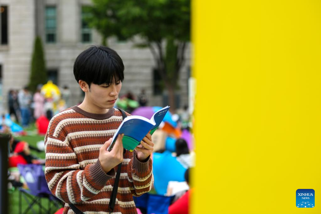 A man reads a book at Seoul Plaza in Seoul, South Korea, April 23, 2023. Reading activities were held at Seoul Plaza and Gwanghwamun Square in downtown Seoul on the occasion of World Book Day, which falls on April 23 every year. (Xinhua/Wang Yiliang)