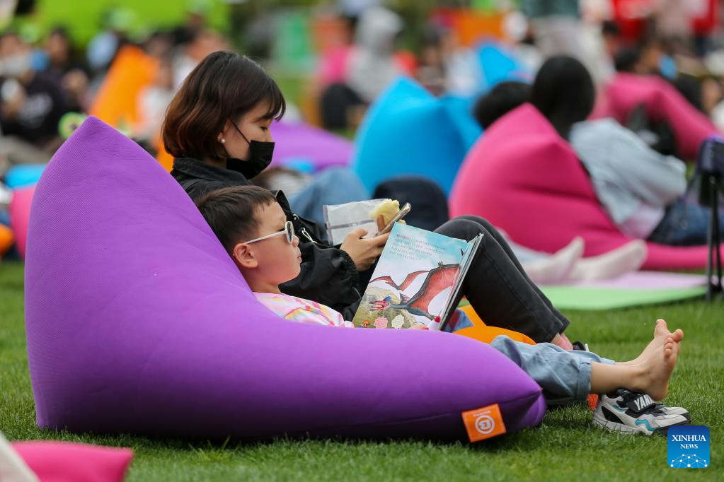 A child reads a book at Seoul Plaza in Seoul, South Korea, April 23, 2023. Reading activities were held at Seoul Plaza and Gwanghwamun Square in downtown Seoul on the occasion of World Book Day, which falls on April 23 every year. (Xinhua/Wang Yiliang)