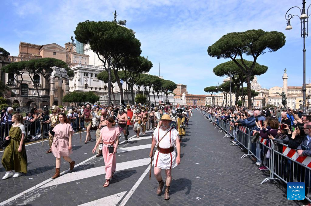 Performers take part in a parade to celebrate the 2,776th birthday of Rome in Rome, capital of Italy, April 23, 2023. The city of Rome turned 2,776 Friday after its foundation by Romulus on April 21, 753 B.C. (Photo by Alberto Lingria/Xinhua)