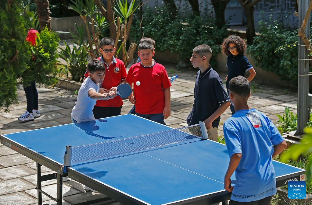 Children play table tennis in celebration of World Table Tennis Day in Beirut, Lebanon, on April 23, 2023. (Xinhua/Bilal Jawich)