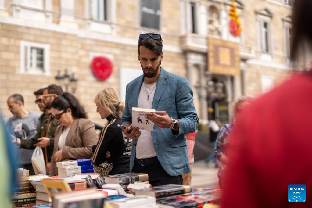 A man chooses books at a stall on a street in Barcelona, Spain, April 23, 2023. People give books and roses to celebrate the day of Sant Jordi, patron saint of Catalonia. (Photo by Joan Gosa/Xinhua)