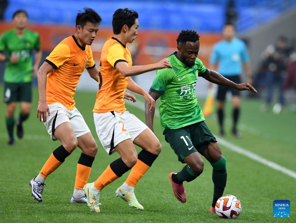 Samuel Adegbenro (R) of Beijing Guoan competes during a 2023 season Chinese Football Association Super League (CSL) match between Qingdao Hainiu and Beijing Guoan in Qingdao, east China's Shandong Province, April 25, 2023. (Xinhua/Li Ziheng)