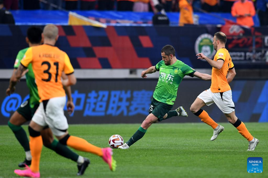 Arijan Ademi (2nd R) of Beijing Guoan shoots during a 2023 season Chinese Football Association Super League (CSL) match between Qingdao Hainiu and Beijing Guoan in Qingdao, east China's Shandong Province, April 25, 2023. (Xinhua/Li Ziheng)