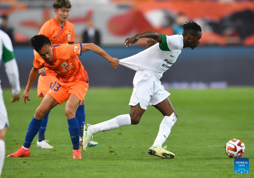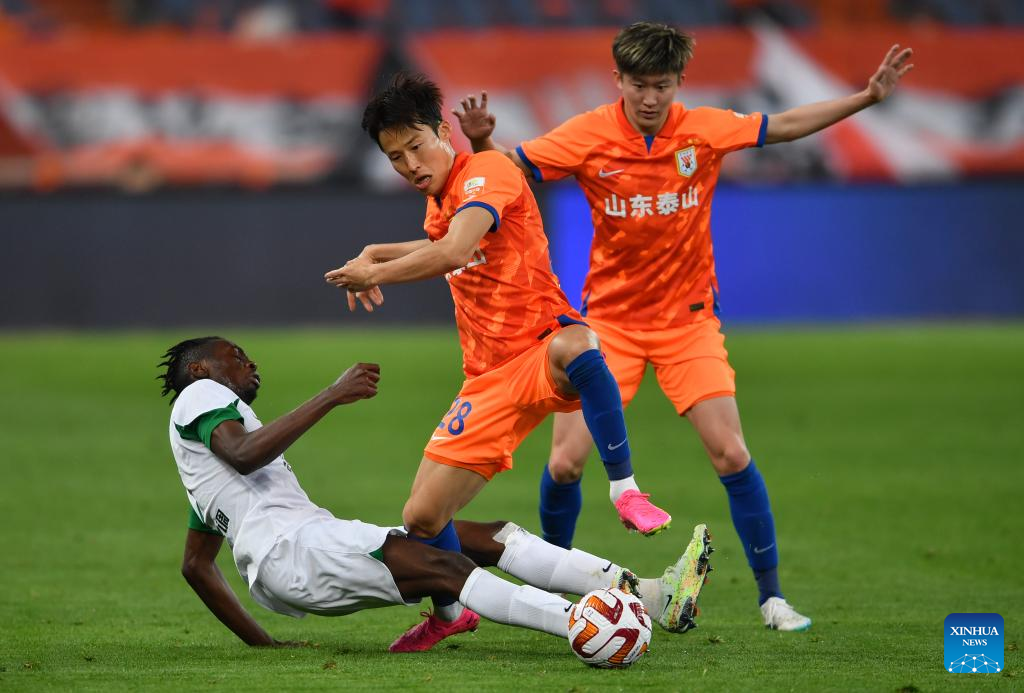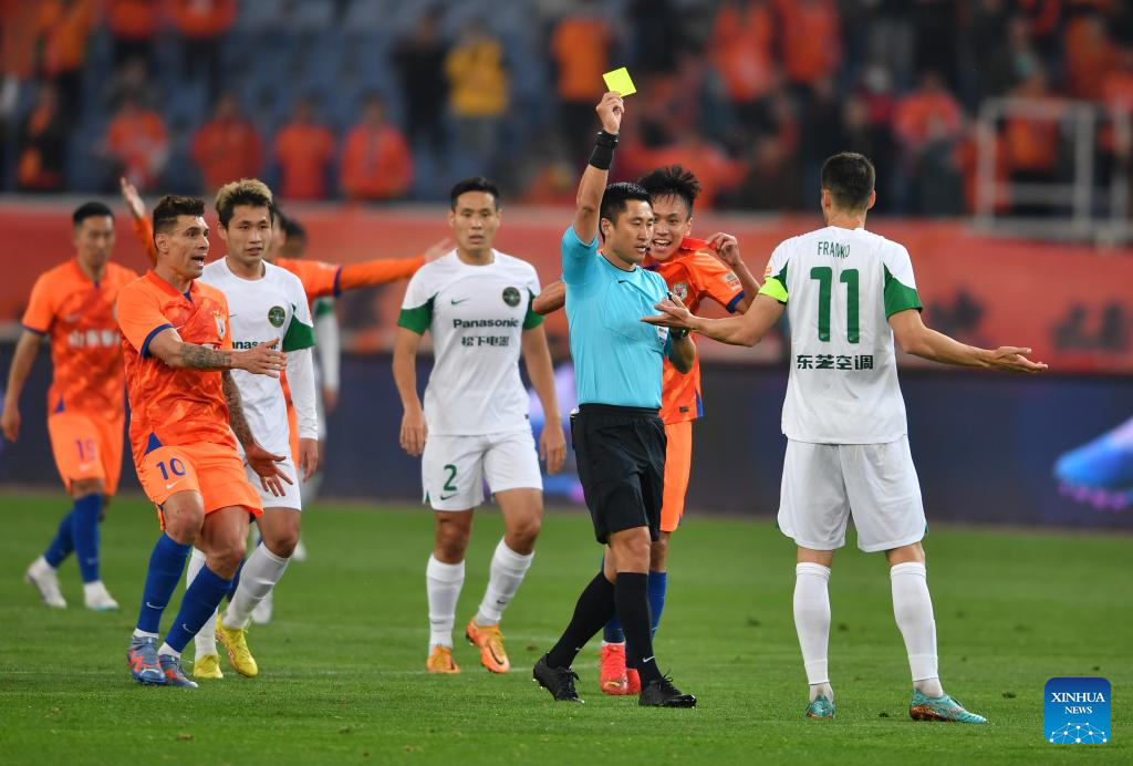 JINAN, April 25 (Xinhua) -- Shandong Taishan edged ten-men Zhejiang FC 2-1, while Qingdao Hainiu beat Beijing Guoan 3-1 to gain their first win in the 2023 Chinese Super League (CSL) on Tuesday.
