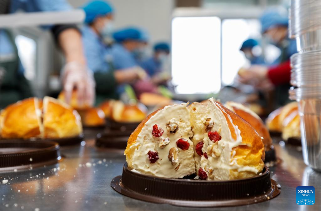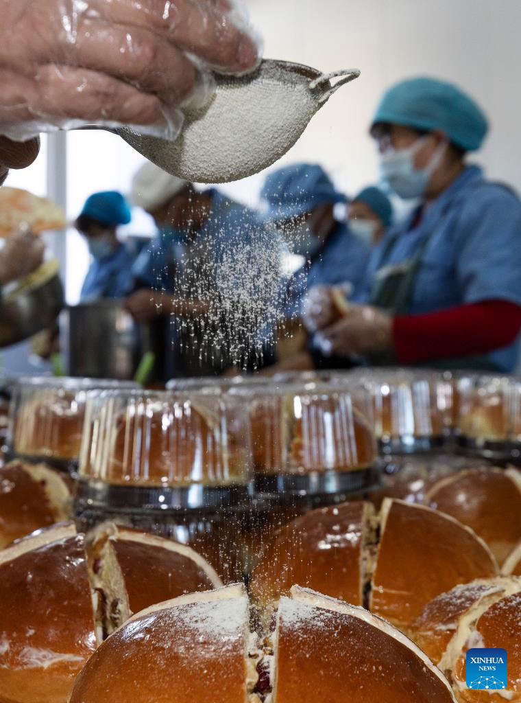 Every day, newly-baked Tacheng cheese bread is not only sent to stores in the city but also delivered to customers across the country through cold chain. (Xinhua/Li Xiang)