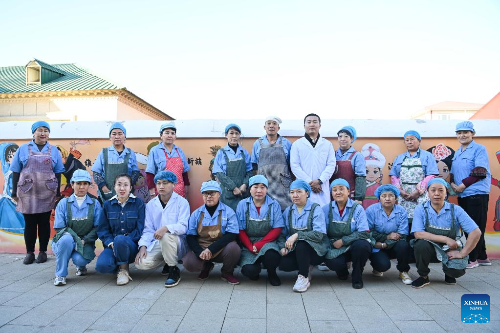 Wang Huipeng (4th R, back row), founder of Jiangqu food company, poses for a group photo with some of his empoyees in the company in Tacheng, northwest China's Xinjiang Uygur Autonomous Region, April 1, 2023. Located on the border of China and Kazakhstan, the small city of Tacheng is home to people of 25 ethnic groups.