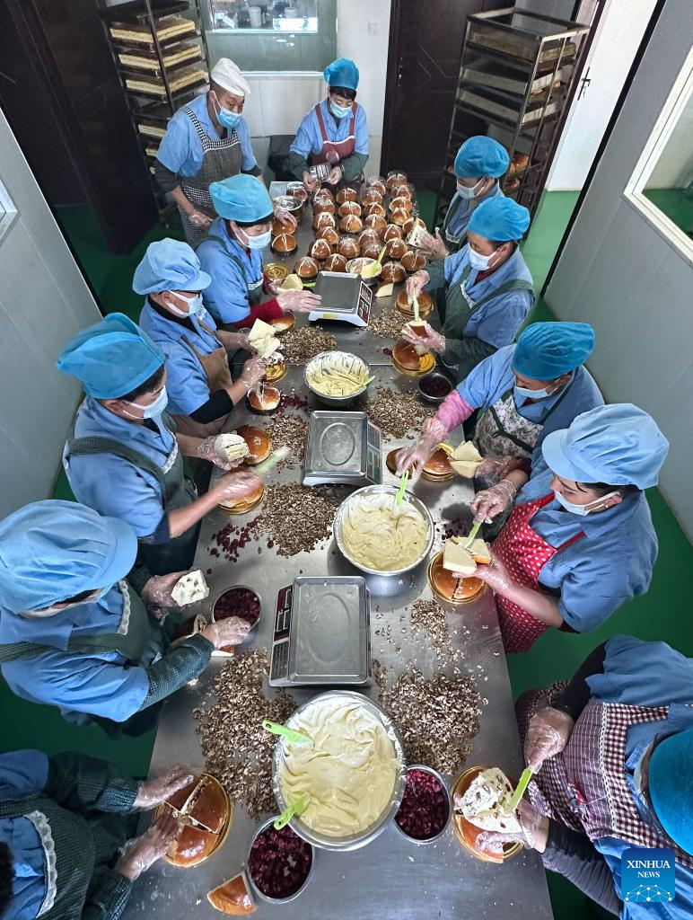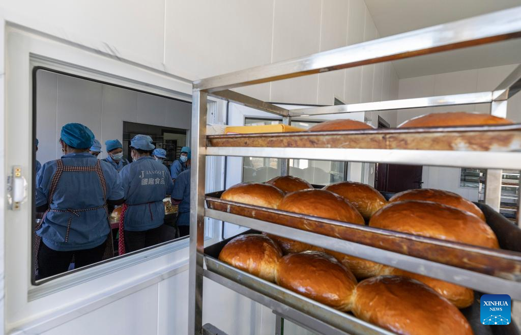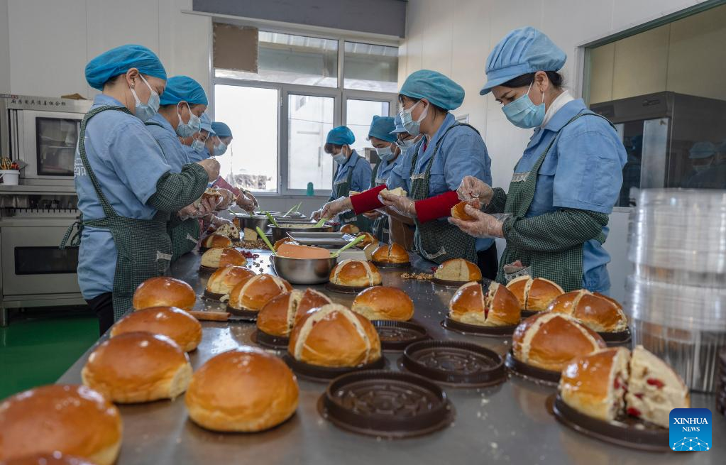 Employees make Tacheng cheese bread at the workshop of Jiangqu food company in Tacheng, northwest China's Xinjiang Uygur Autonomous Region, April 1, 2023. Located on the border of China and Kazakhstan, the small city of Tacheng is home to people of 25 ethnic groups.