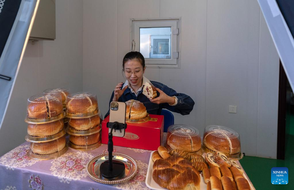 An employee sells Tacheng cheese bread through livestreaming at Jiangqu food company in Tacheng, northwest China's Xinjiang Uygur Autonomous Region, April 1, 2023. Located on the border of China and Kazakhstan, the small city of Tacheng is home to people of 25 ethnic groups.