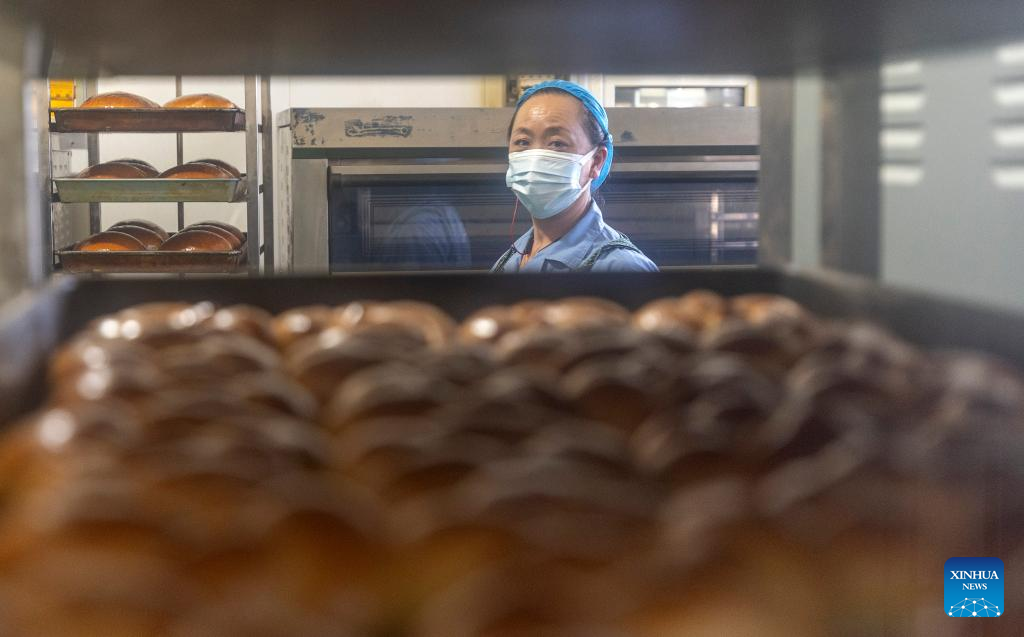 An employee checks Tacheng cheese bread at the workshop of Jiangqu food company in Tacheng, northwest China's Xinjiang Uygur Autonomous Region, April 1, 2023. Located on the border of China and Kazakhstan, the small city of Tacheng is home to people of 25 ethnic groups.