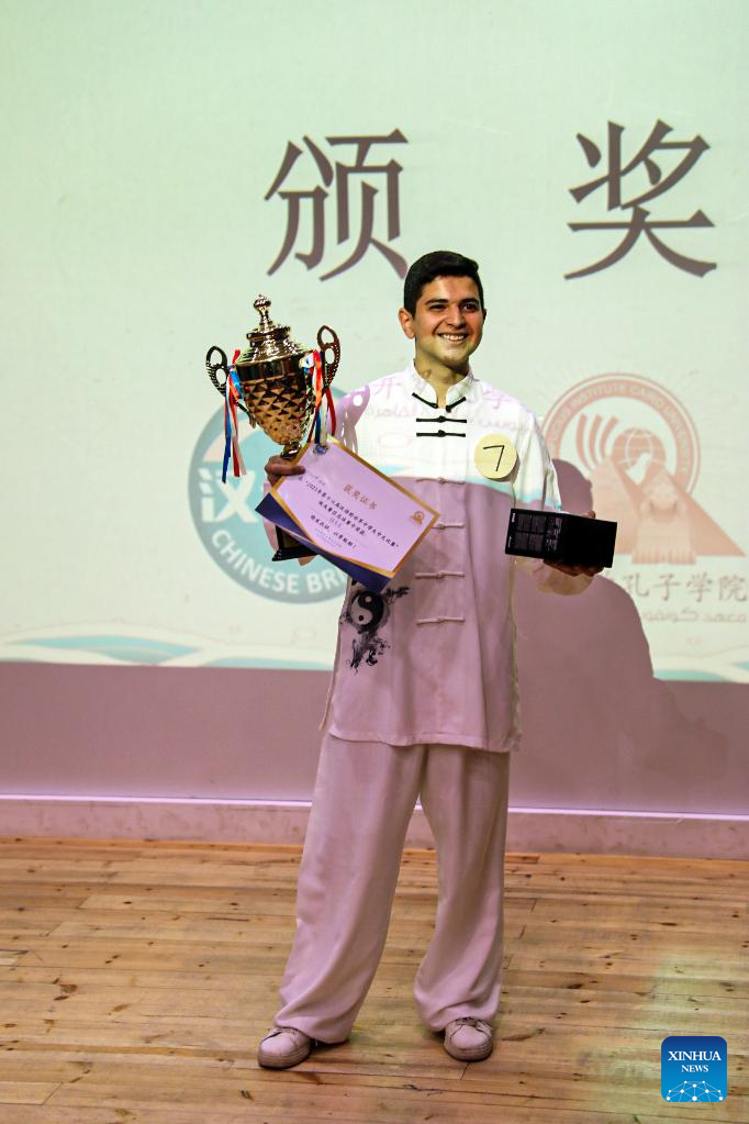 ( Egyptian student Mohamed Esmail poses with prizes for a photo during a Chinese Bridge language contest in Cairo, Egypt, on April 27, 2023. A qualifying round of an annual Chinese proficiency contest for foreign students concluded here in the Egyptian capital on Thursday. (Xinhua/Ahmed Gomaa)