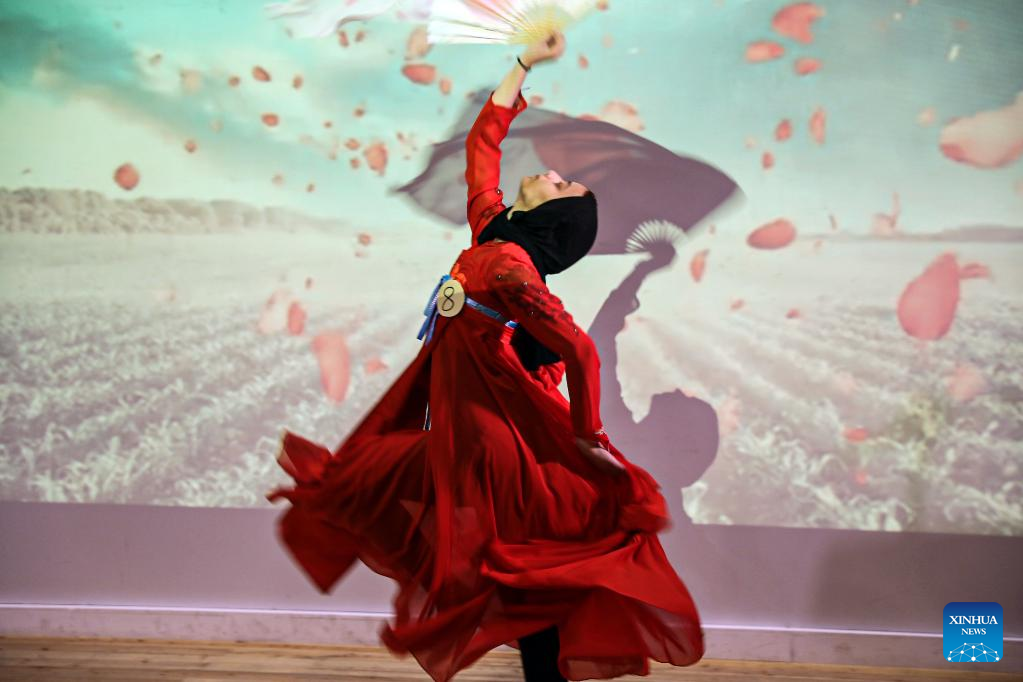 ( An Egyptian student performs during a Chinese Bridge language contest in Cairo, Egypt, on April 27, 2023. A qualifying round of an annual Chinese proficiency contest for foreign students concluded here in the Egyptian capital on Thursday. (Xinhua/Ahmed Gomaa)