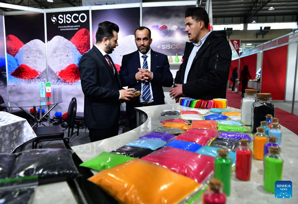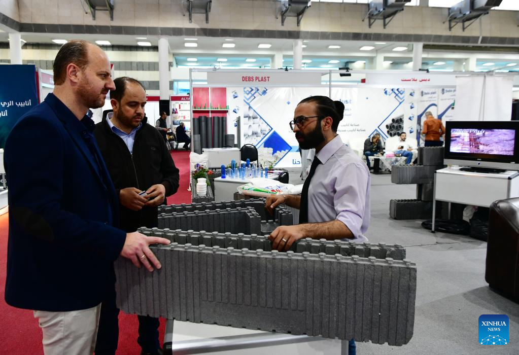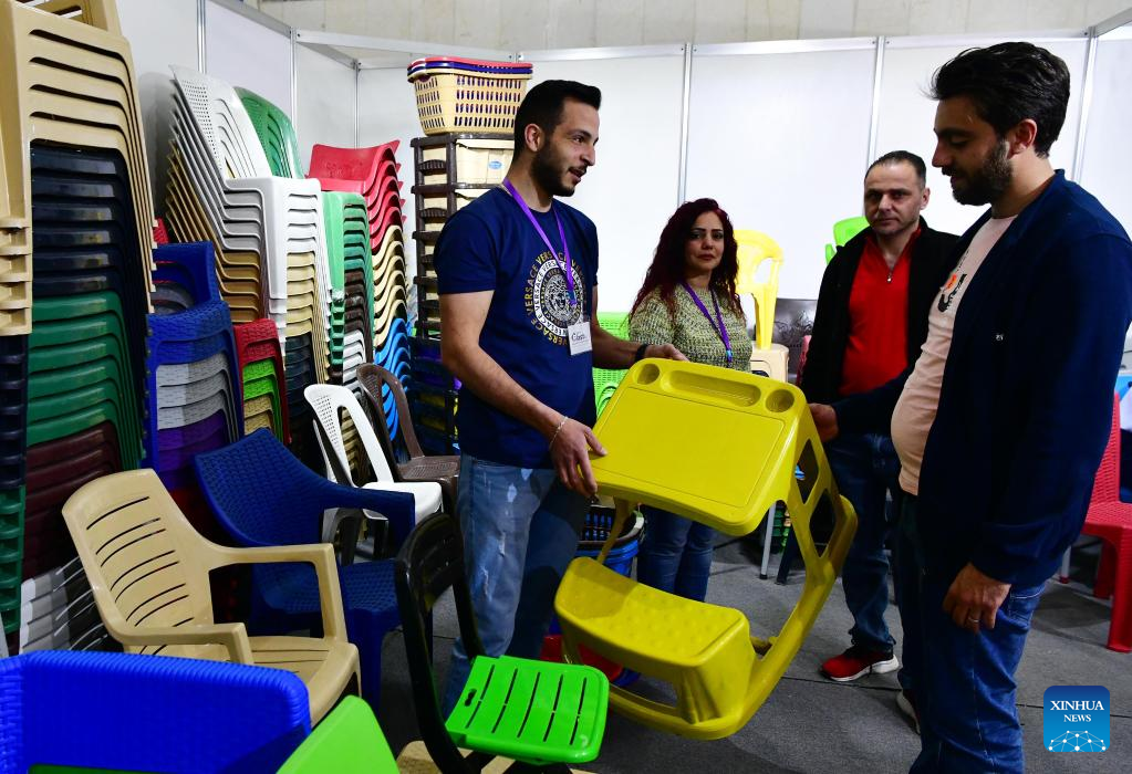 People talk at a stand during a plastic ware fair in Damascus, Syria, on April 28, 2023. (Photo by Ammar Safarjalani/Xinhua)